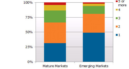 该报告还发现,在成熟市场家庭平均拥有2.4台电视,而在新兴市场平均每户为1.8台。成熟市场中,超过三分之二的家庭有一台以上电视,但在新兴市场近一半的家庭只有一台电视。鉴于平板电视持续推出新机种、价格益加实惠、以及消费者对高品质、大屏幕和高清晰度电视的消费欲望,和成熟市场的消费者一样,越来越多的新兴市场消费者购买平板电视(主要是液晶电视)来汰换他们现有的旧款式电视。