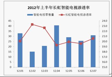 根据奥维咨询对全国*城市*家门店的市场监测数据显示,2012年上半年国内平板电视电视零售量691.2万台,同比下降20.9%,零售额286.3亿元,同比下降27.9%。在这种市场疲软环境下,智能电视的渗透率却逆势上升,同期智能电视零售量达到163.9万台,同比上升193.1%,零售额达到97.8亿元,同比上升170.7%。