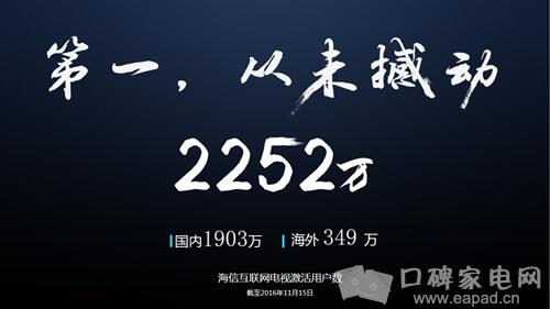 中怡康数据显示,2016年1-10月,海信电视在国内中高端市场的份额是17.74%,在55吋及以上大尺寸、中高端产品上超越外资“3S”品牌(三星、夏普、索尼),实现高端用户占有率中国第一。